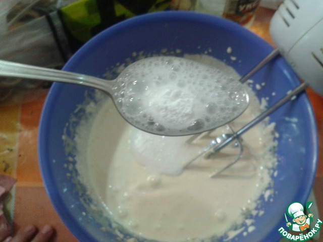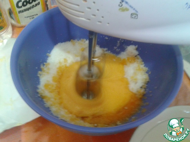 В 1 столовой ложке уксуса гасим 1 ч. л. (без горки) соды. Выливаем в желтки.