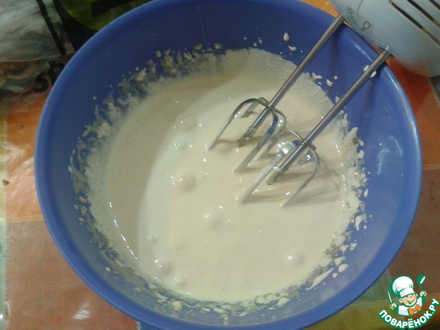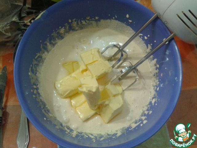Добавляем размягченное сливочное масло. Взбиваем миксером.