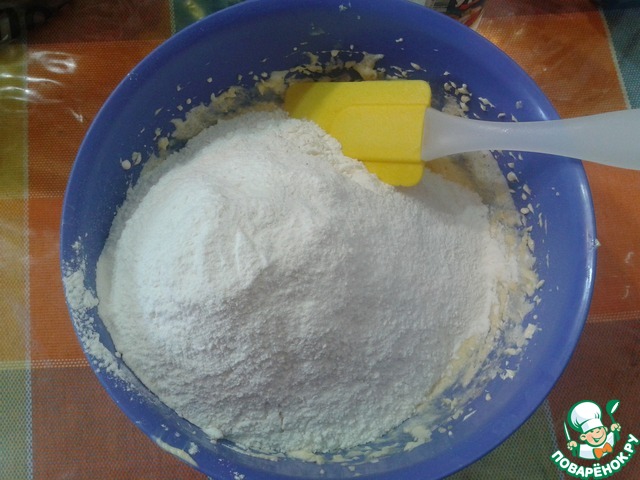 Добавляем просеянную муку. Замешиваем тесто сначала в чашке, а потом на столе. Тесто очень сильно липнет к рукам, но муку добавлять больше не надо. При помощи силиконовой лопатки с этим очень легко справиться.
