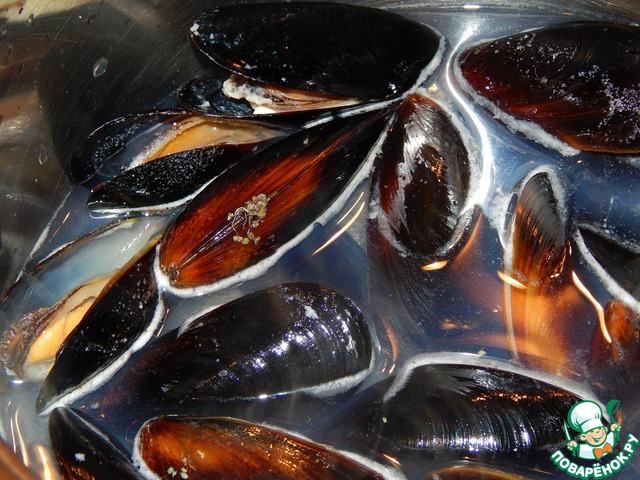 Мидий заливаем 2 стаканами воды, солим и варим 7 минут.
