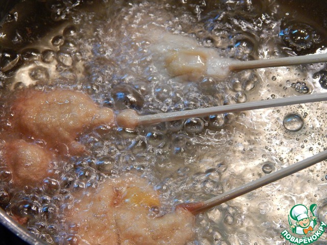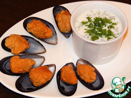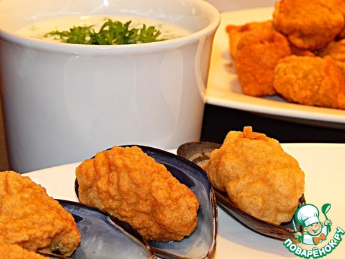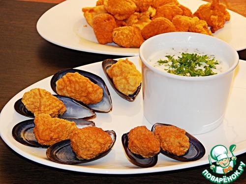 Разогреваем масло. Мидий нанизываем на шпажки, обмакиваем в тесто и опускаем в масло. Обжариваем до золотистого цвета.