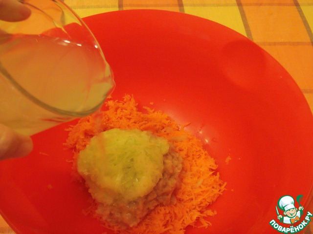 Натереть на мелкой терке морковь, кабачок, яблоко. Добавить сыворотку.