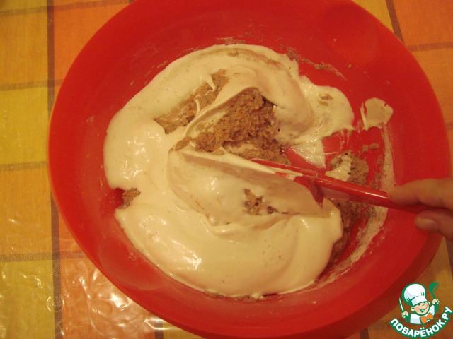 Соединить фруктово-овощную смесь с мукой, осторожно вмешать взбитые белки. Тесто получается не слишком густое, как на оладьи. Если кабачок или яблоко были чересчур сочными, может потребоваться муки чуть больше.