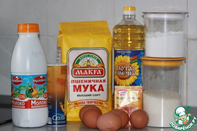 Яйца, сахар, соль, молоко и разрыхлитель смешиваем до однородной массы, затем постепенно добавляем просеянную муку и замешиваем тесто.