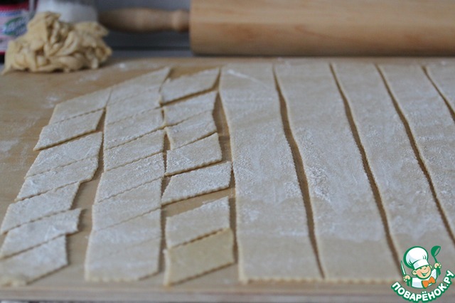 Раскатываем тесто на присыпанной мукой поверхности очень тонко. Это важно, потому как если этого не сделать, то получится совершенно другое блюдо (котлама). разрезаем тесто на ромбики (у меня это приблизительно 3,0х3,5см)