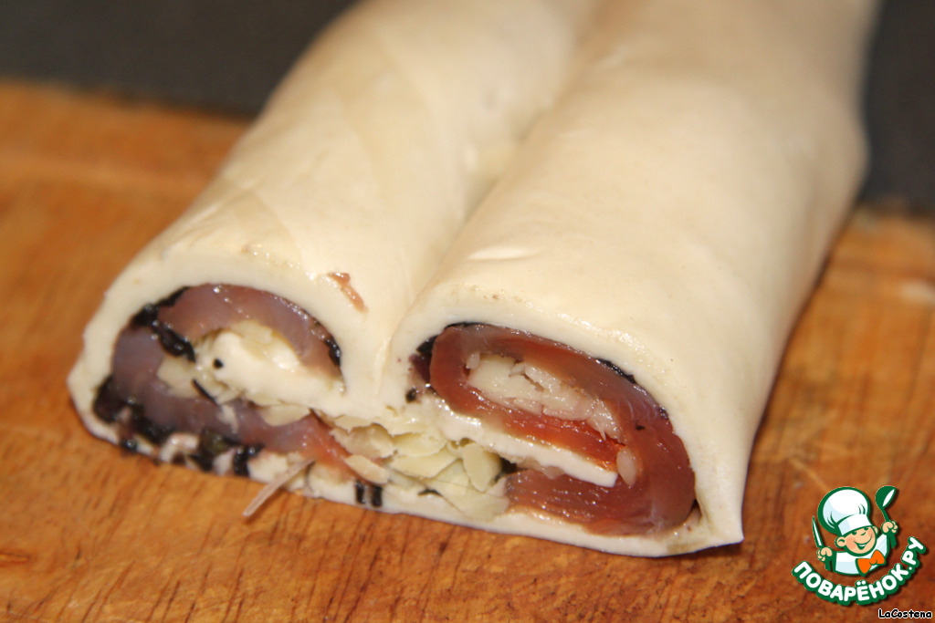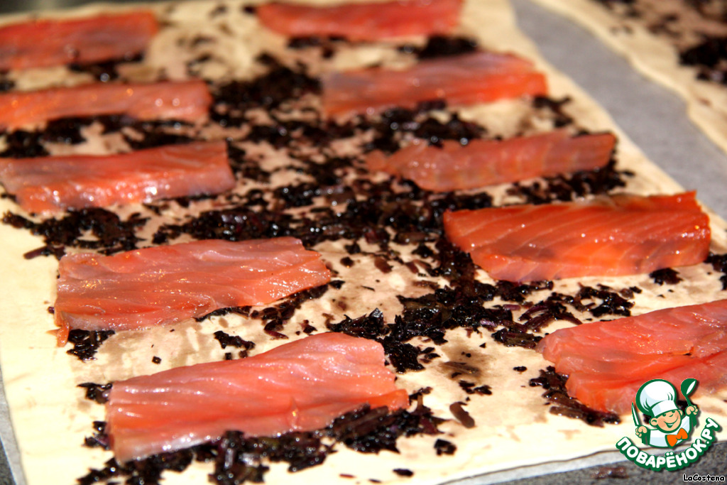 Слабосоленую семгу нарезать дольками и выложить на слоеное тесто.