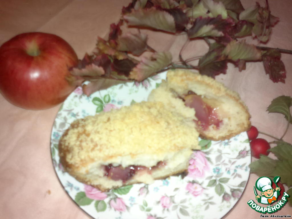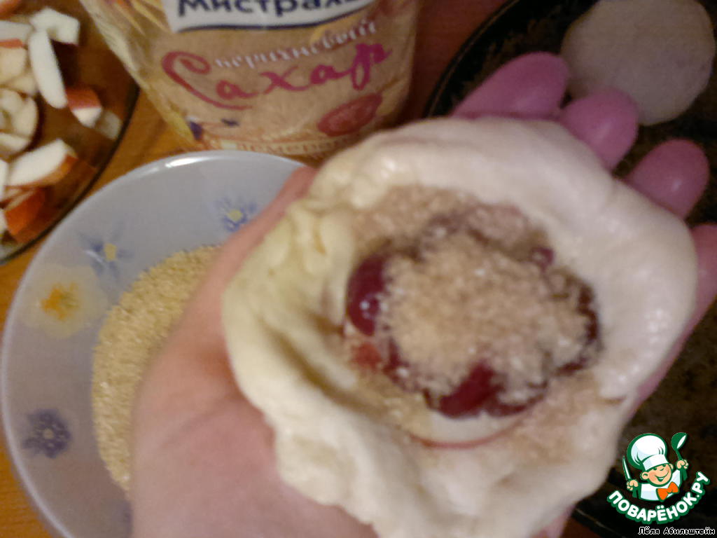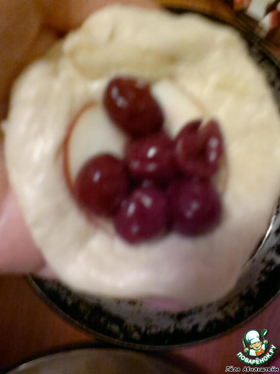 Отрезаем кусок теста от этого жгута, разминаем руками в кружок. Кладем на кружок две дольки яблока, штук 5-7 вишенок и...