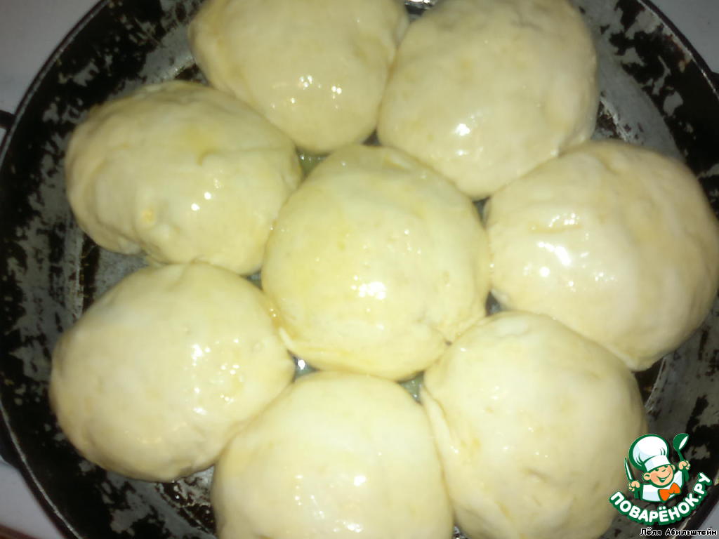 Затем тесто собираем наверх, как бы делаем мешочек с начинкой, и защипываем дырку. Складываем наши пышечки в смазанную форму (у меня чугунная сковорода) защипом вниз. Примерно вот так. Даем немного подняться и смазываем пышечник яйцом.