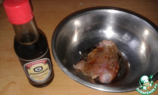 Для начинки куриное бедро посыпать базиликом, залить соевым соусом и мариновать около получаса.