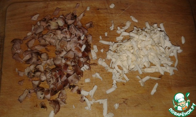 Затем запечь в духовке и нарезать мелкими кубиками. Сыр натереть на крупной терке