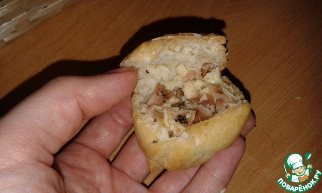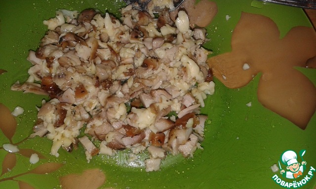 Смешать сыр и курицу. Перед тем как начинять профитроли прогреть 1-2 минуты в микроволновке, чтобы сыр слегка расплавился