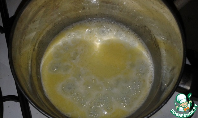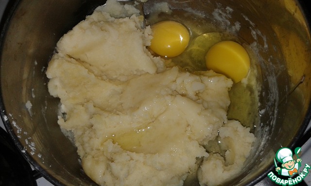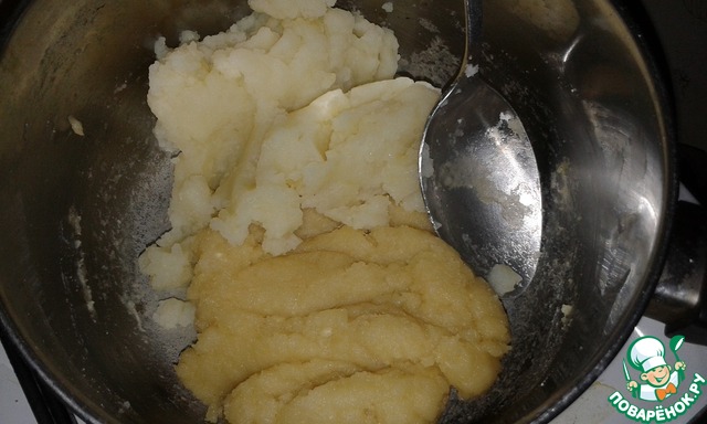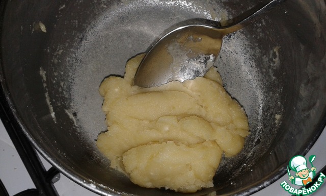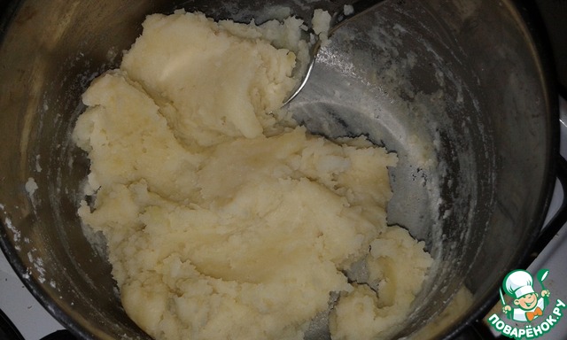 Дать тесту немного остыть и положить картофельное пюре (картофель должен хорошенько свариться, чтобы не было комочков)