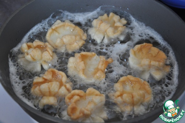 Тесто раскатать как можно тоньше, вырезать небольшие кружочки. В центр кружочка капнуть желтка, положить сверху второй и прищепнуть. Края разрезать ножом. Если нет времени, то можно разрезать как обычный хворост, что я и сделала с обрезками.