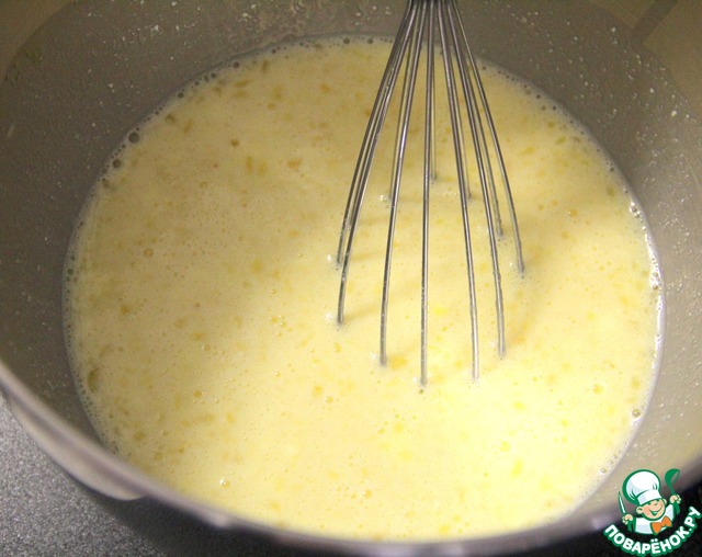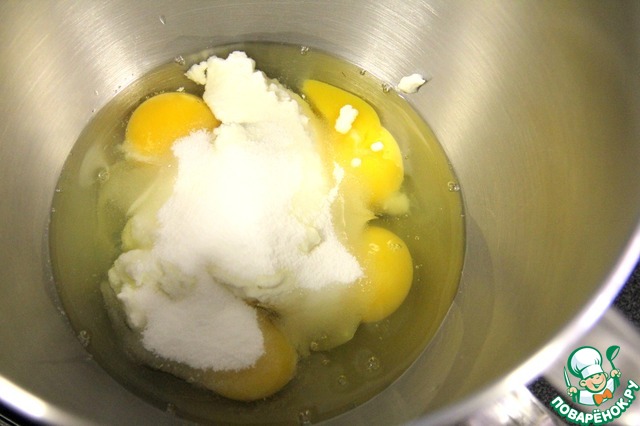 Смешиваем яйца, рикотту и сахар.