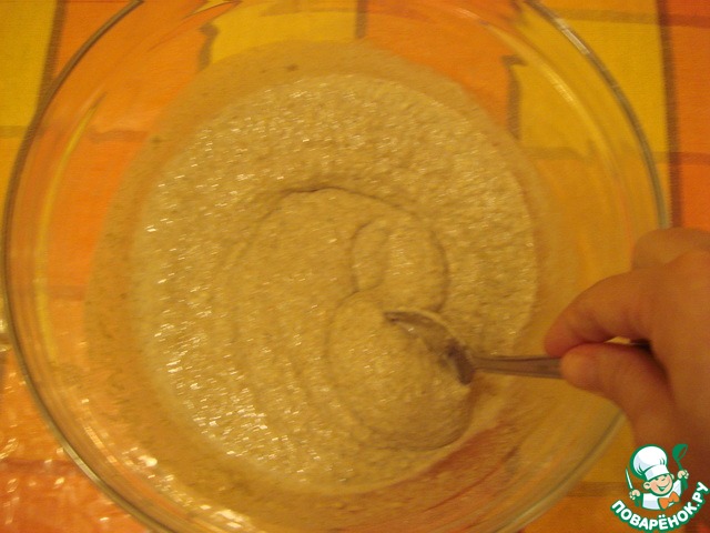 Потихоньку вливаем сыворотку, размешивая. У меня ушло около стакана, в зависимости от влажности муки и жирности сметаны может уйти больше или меньше. Ориентируйтесь по консистенции: тесто должно быть как густая сметана, или как на оладьи. У меня это фото не очень получилось, но понять можно.