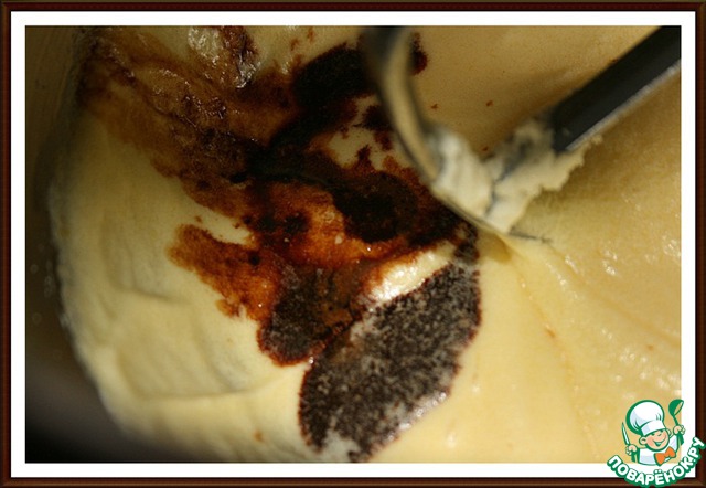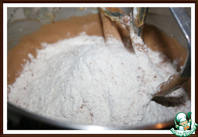 7. Добавить муку к яйцо-кофейно-шоколадной микстуре и на маленькой скорости перемешать миксером, до однородности.