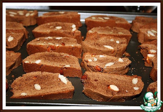 12. Разрезать 2 см в толщине и отправить в духовку на 5 минут, перевернуть и печь ещё 5-6 минут или больше, кому как нравится. Дать полностью остыть на решётке.