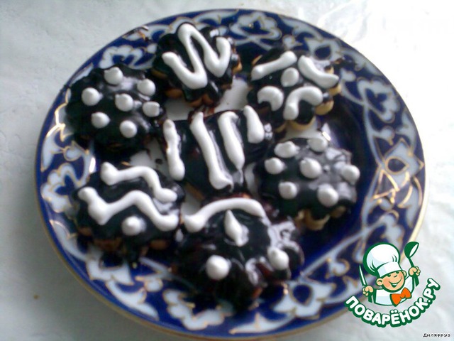 Пока наши печеньки выпекаются приготовим шоколадный глазурь:перемешать 2 ст.л сахар с 2 ст.л какао и налить холодное молоко.Перемешивая поставить на огонь и довести до кипения.Кипятить на медл огне до чуть загустения и добавить слив масло и еще прокипятиь 3-4-мин.Охладить.