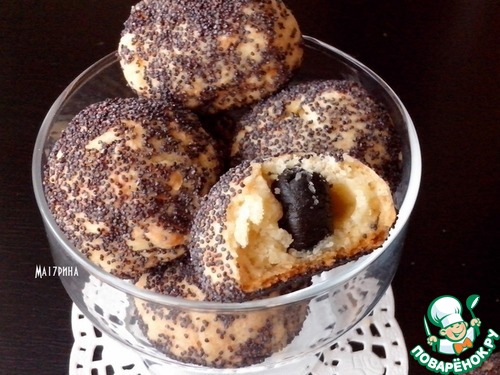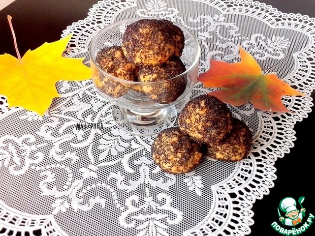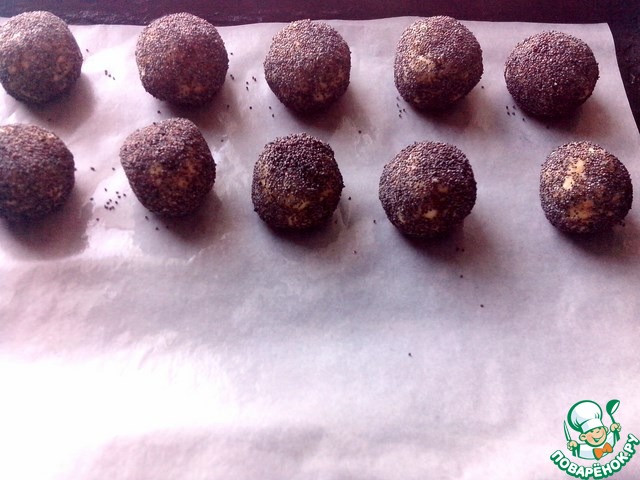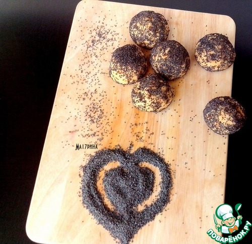 Тесто разделить на 20 частей. У меня 10 частей, т. к. я взяла половину ингредиентов. Скатать шарики (d=3 см), примять их пальцами, сделав маленькую лепешку. На каждую лепешечку положить по маслине. Защипать края и скатать обратно шарик. Обвалять в любой посыпке (мак, кунжут, молотый орех, семена льна). Я обваляла в маке.
