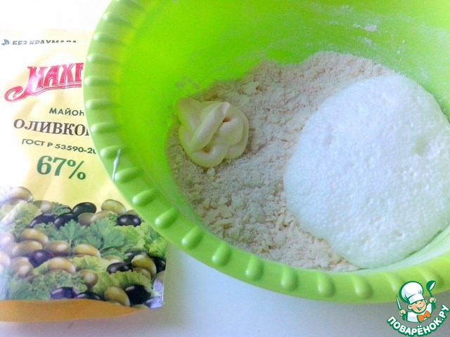 В сметану положить гашеную соду, размешать и добавить в муку. Также добавить майонез и соль. Я добавила оливковый майонез ТМ "Махеев". Замесить тесто. Тесто получится мягкое и эластичное.