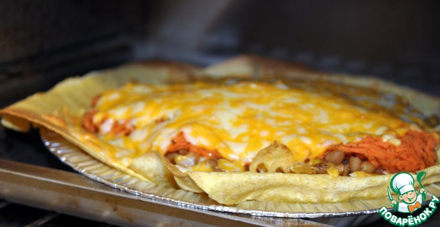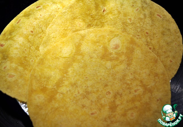 Кукурузные лепешки (печём сами или используем покупные) кладем на дно формы для выпечки внахлёст.