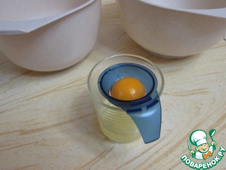 В отдельной посуде взбить белки с щепоткой соли в крепкую пену, затем постепенно добавить оставшийся сахар. Сахар должен полностью раствориться при взбивании.