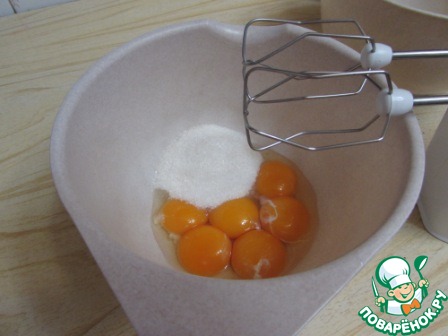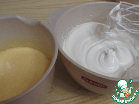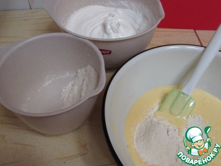 В желтковую массу постепенно ввести муку, вымешивая лопаточкой или ложкой до гладкости не допуская комков. В желтково-мучную массу порционно ввести белки, перемешивая тесто снизу вверх. Миксером не взбивать! Тесто на глазах становится воздушным и легким.