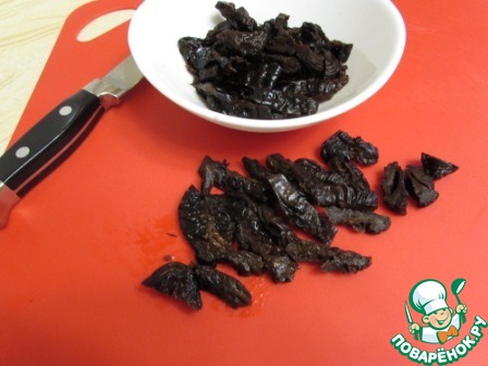Чернослив, который мы замачивали в воде, перед началом работы, порежем дольками.