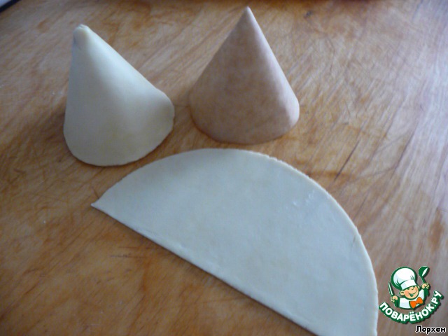 Картон с пекарской бумагой (она сверху) делаем конусом и сверху укладываем тесто.