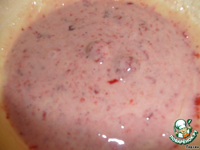 "Розовый снег": желток перемешиваем с сахаром, добавляем молоко, нагреваем до кипения на водяной бане, остужаем, добавляем свежую клубнику, перетертую с сахаром. Охлаждаем в холодильнике.