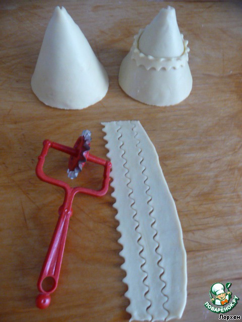 Из теста также вырезаем тесторезкой вот такие волнистые полосочки. Это будет крона елки.