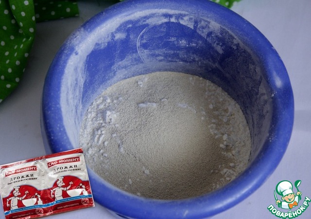 Муку просеять, добавить соль, сахар, сухие дрожжи. Перемешать