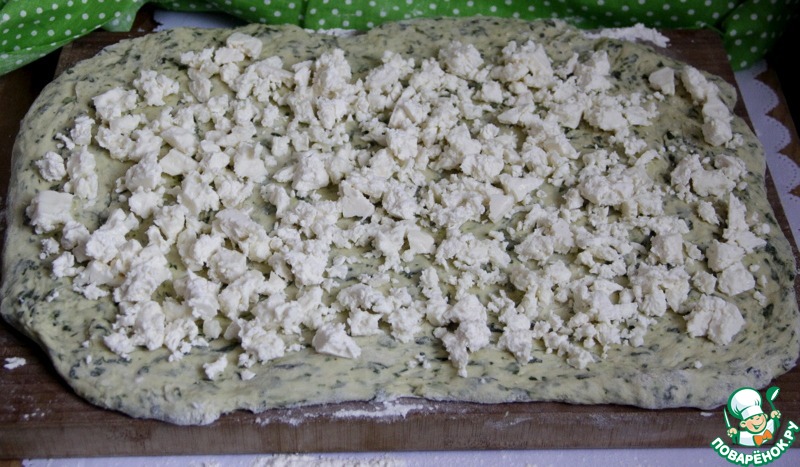 Разбросать по тесту небольшие кусочки мягкой брынзы (кол-во брынзы регулируйте сами, в зависимости от ее солености и Ваших вкусов!)