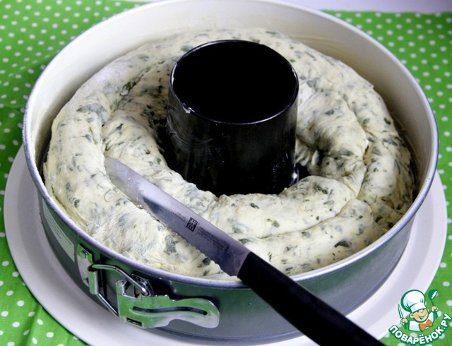 Круглую форму для запекания смазать сливоч. маслом. Выложить кругом рулет, сделать глубокий надрез посередине, вдоль.