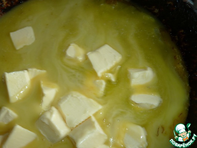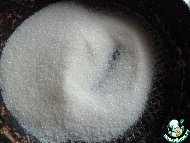 В начале хочу сказать, что автор не советует заменять ингредиенты. Все продукты должны быть свежими. Итак, приступим. Стакан сахара высыпаем на чугунную сковородку. Прощу прощения за свою старенькую и страшненькую)