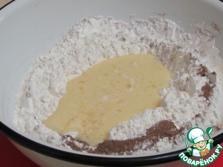 Сделайте углубление в мучной горке и влейте в нее яичную смесь.