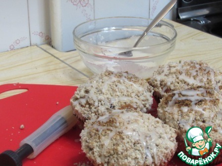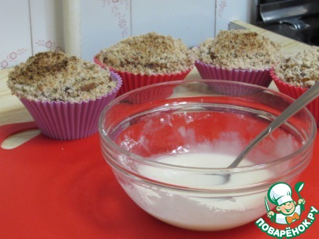 Далее глазурью покрываем верхушки маффинов. Делайте это удобным для вас способом, я попробовала кондитерскую ручку.
