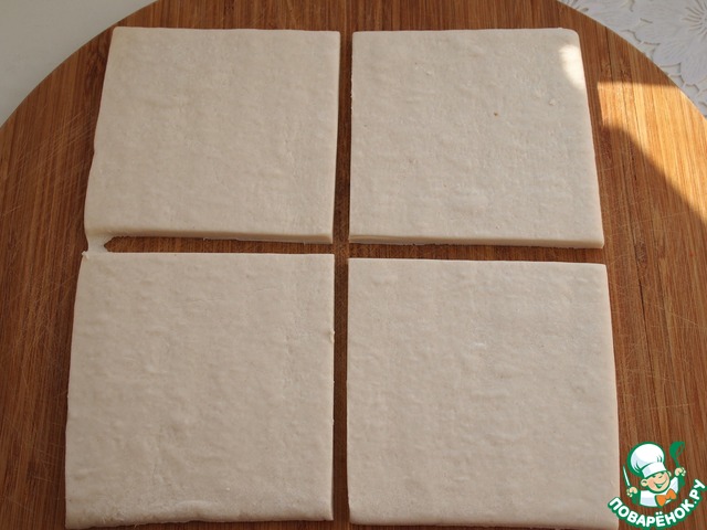 Тесто предварительно разморозить, разрезать на 4 прямоугольника.