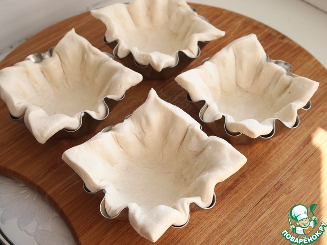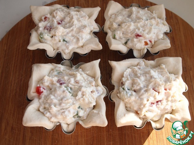 Разложить начинку по формочкам с тестом. Выпекать в духовке, заранее разогретой до 220 градусов, 15 минут. После выключения духовки, дать еще там постоять 5 минут.