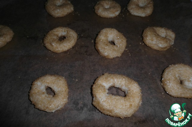 2. Достаем охлажденное тесто, делим его на две части, и каждую половину еще на двенадцать частей. Скатываем маленькие шарики, потом раскатываем в жгут и делаем колечко. Обваливаем в сахаре.