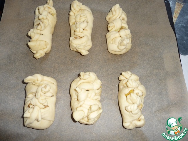 Плетеночки выложить на противень, застеленный пекарской бумагой, накрыть пленкой и оставьть на 20 – 30 мин., расстояться.