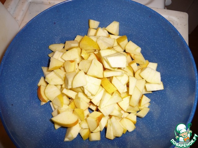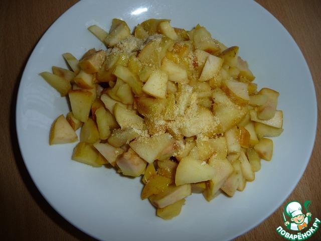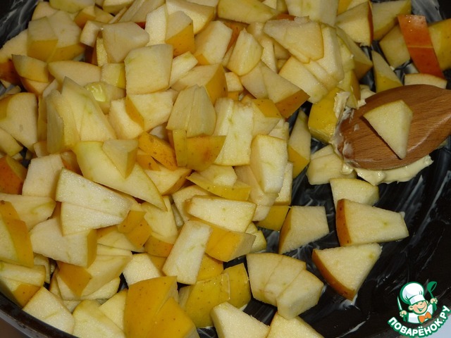Взять небольшой кусочек сливочного масла и слегка обжарить в нем яблоки, добавить 2 ч. л. сахара.