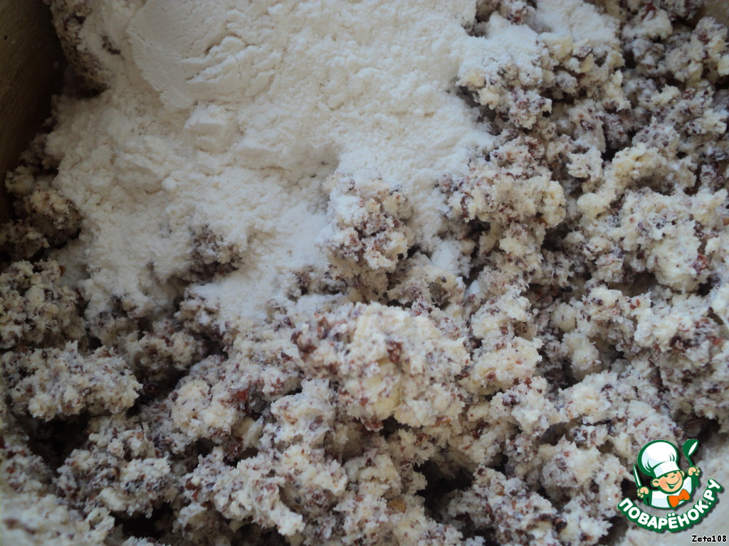 Смешать миксером сливочное масло, яблочную муку, пшеничную муку, сахар, яичный желток (белок пока отложим в сторонку), корицу.