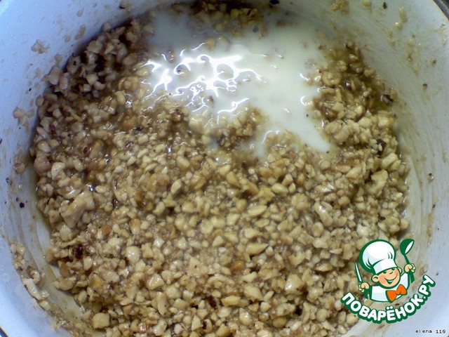 Масло растопить, добавить сахар, орехи, воду и немного прокипятить до выпаривания жидкости. Снять с огня,добавить сгущёнку, перемешать и остудить.