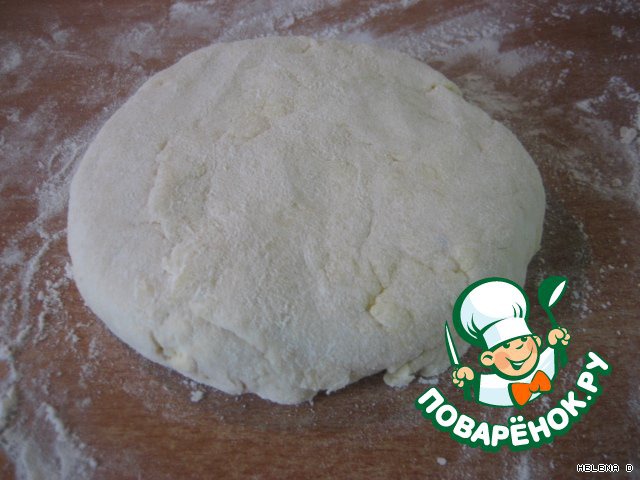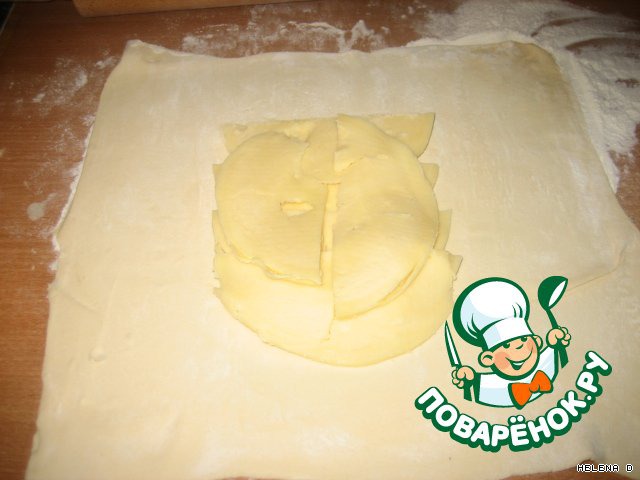 Раскатываем тесто и укладываем на него сыр (порезанный или лучше натертый) таким образом, чтобы можно было потом ещё раз раскатать (смешать тесто с сыром) и придать форму, проколоть вилкой...