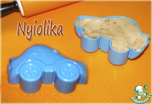 Кусочек теста разравниваем в формочке (смазанной маслом) Обычная формочка для игр в песке (правда новая), размер - внушительный, качество пластика отличное, а самое главное - фигурки с прорисованными деталями и нашими детьми очень и очень любимые :)