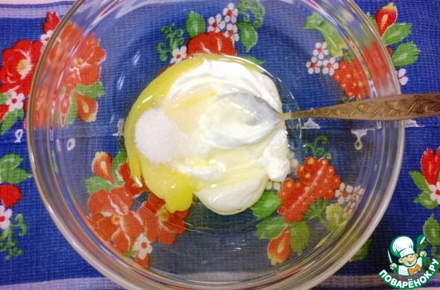 Тесто я решила сделать сметанное, поскольку упаковка сметаны была уже вскрыта:). Сметану, масло растительное, яйцо растереть с сахаром.