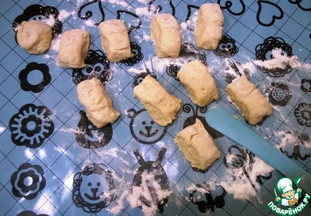 В нужный момент нагреваем духовку до 200 градусов. Тесто делим на небольшие кусочки.