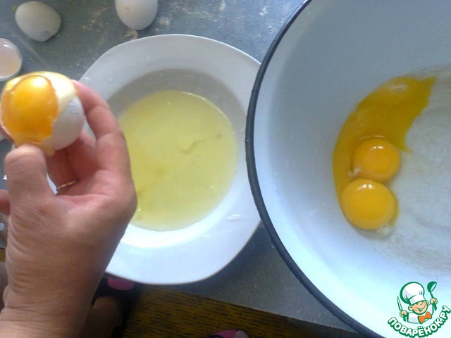 Желтки отделить от белков и и положить их в глубокую миску, в которой мы будем делать тесто