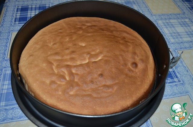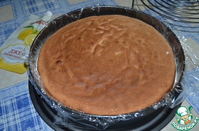 Бисквит разрежем по горизонтали и пропитаем сиропом (сварить 0,5 стак. воды с сахаром и 1 ст. л. джема)